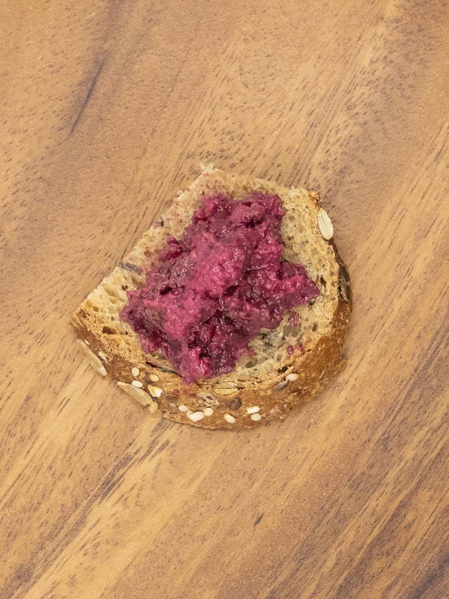 Barbabietola, olio EVO, mandorle, porro, succo di limone, sale, aceto di vino bianco (con solfiti), semi di coriandolo.